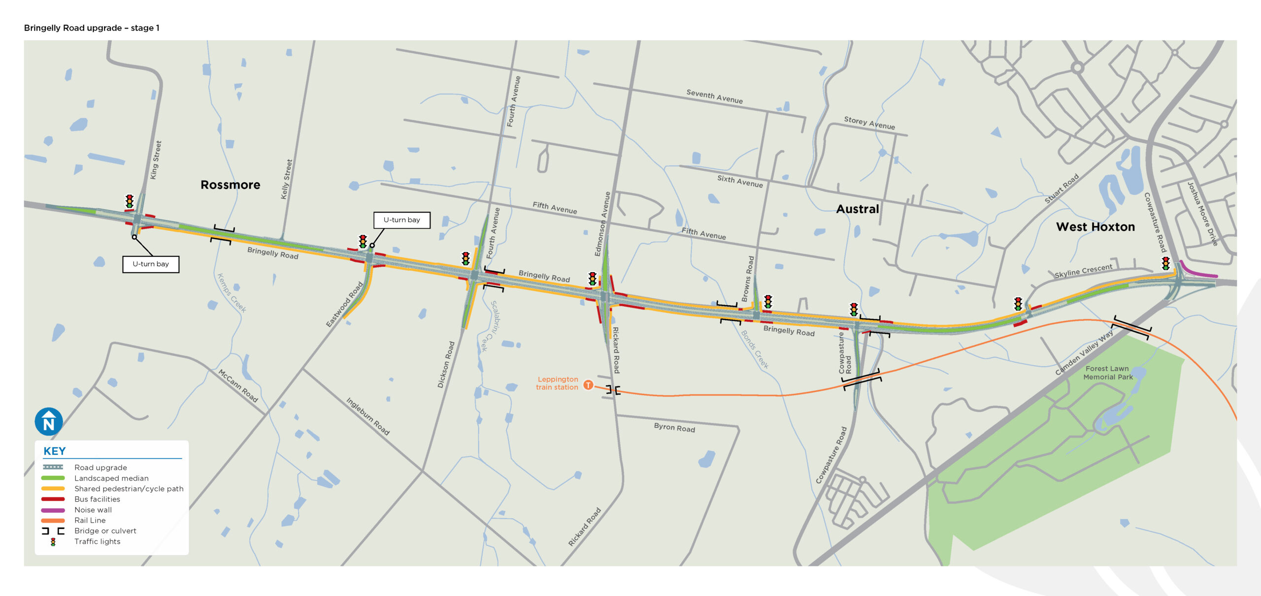 This 10 kilometre project will include the upgrade of Bringelly Road from two lanes to a six lane divided road between the eastern side of Upper Canal bridge and the western side of the Eastwood Road intersection, through the future Leppington Town Centre. The rest of Bringelly Road will also be upgraded from two lanes to a four lane divided road with a central median, which would allow for widening to six lanes, when required.